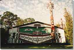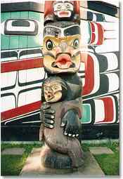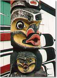 A great heraldic totem pole stands in front of the Kwakwaka'wakw house in Thunderbird Park. Painted across the housefront is the face of a giant sea monster in the form of a spiny fish called a sculpin. The totem pole was designed and carved by the Kwakwaka'wakw artist, Chief Mungo Martin. The bottom figure on this pole is a Dzunuk'wa who married an ancient hero at the dawn of time. She holds her son from this marriage, who is half human and half Dzunuk'wa, against her body.